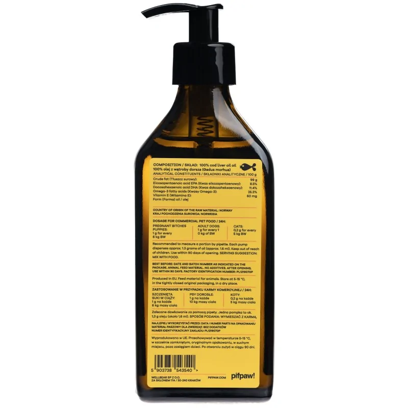 Olej z wątroby dorsza Pifpaw to naturalny dodatek wspierający zdrowie psów i kotów, bogaty w kwasy tłuszczowe Omega-3, w tym EPA i DHA. Te cenne składniki pomagają utrzymać skórę Twojego pupila w dobrej kondycji, redukując suchość i łuszczenie się, a jednocześnie nadają sierści zdrowy blask i gęstość. Regularne podawanie oleju może sprawić, że Twój zwierzak będzie wyglądał jak z okładki magazynu dla czworonogów!