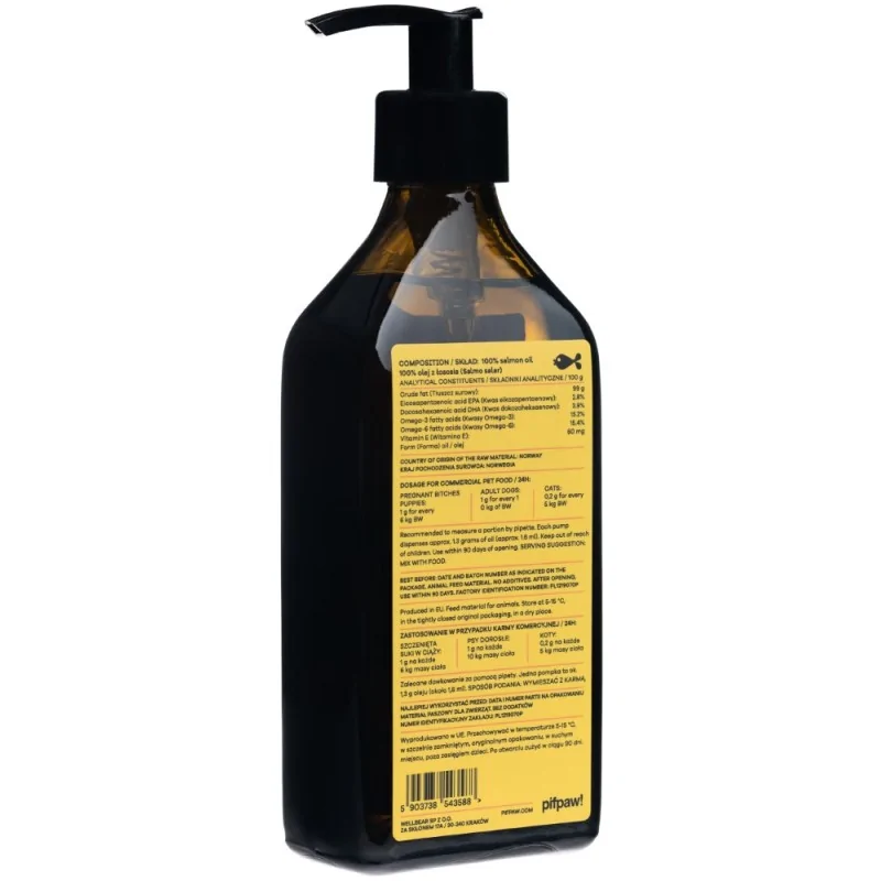 Olej z łososia Pifpaw to prawdziwy skarb dla psów i kotów, bogaty w kwasy tłuszczowe Omega-3 i Omega-6. Te cenne składniki pomagają utrzymać skórę Twojego pupila w dobrej kondycji, redukując suchość i łuszczenie się, a jednocześnie nadają sierści zdrowy blask i miękkość. Regularne podawanie oleju może sprawić, że Twój zwierzak będzie wyglądał jak z okładki magazynu dla czworonogów!